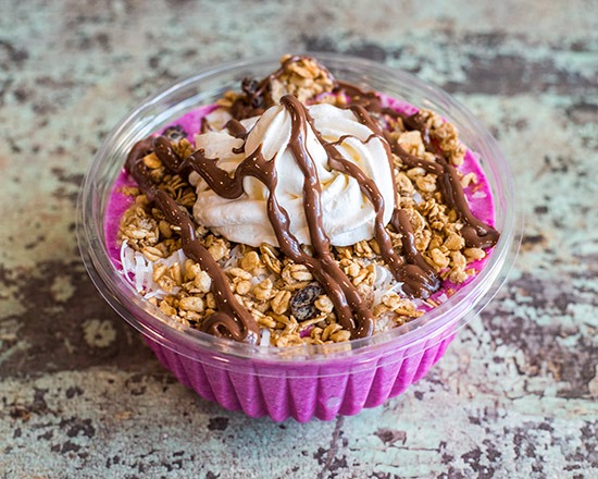 Almond Milk based topped with Banana, Granola, Coconut Flakes & Non-Dairy Whipped Cream, Drizzled with Honey