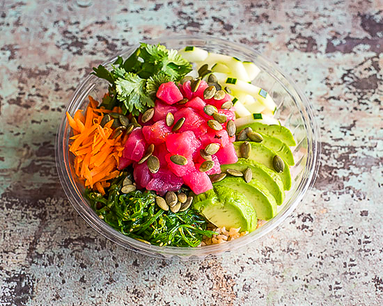 Ahi Tuna Sashimi, topped with Green Onion, Cucumber, Cilantro, Jalapeno and the FUEL Poke Sauce, sprinkled with Furikake
