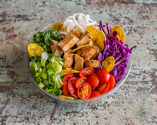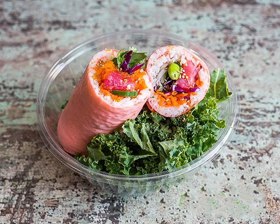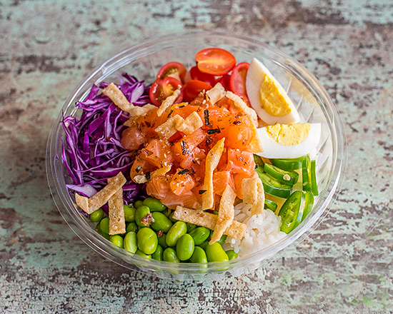 Spicy Salmon Crunch toped with Avocado, Chopped Kale, Purple Cabbage, Carrots and Edamame, with Ginger Carrot Sauce and Crunchy Onions, Sprinkled with Furikake
